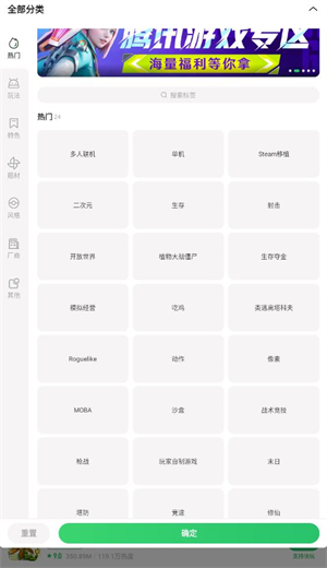 2、第二种是点击下方的分类发现,然后点击更多分类,根据你想要游玩的游戏类型然后点击确定来寻找。