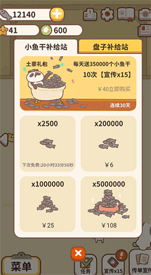 3、如果购买物品时鱼干数量不足,系统会给出提示,此时可以通过观看15秒广告直接补齐所需鱼干,也能直接购买该物品,不过每天观看广告的次数是有限制的。