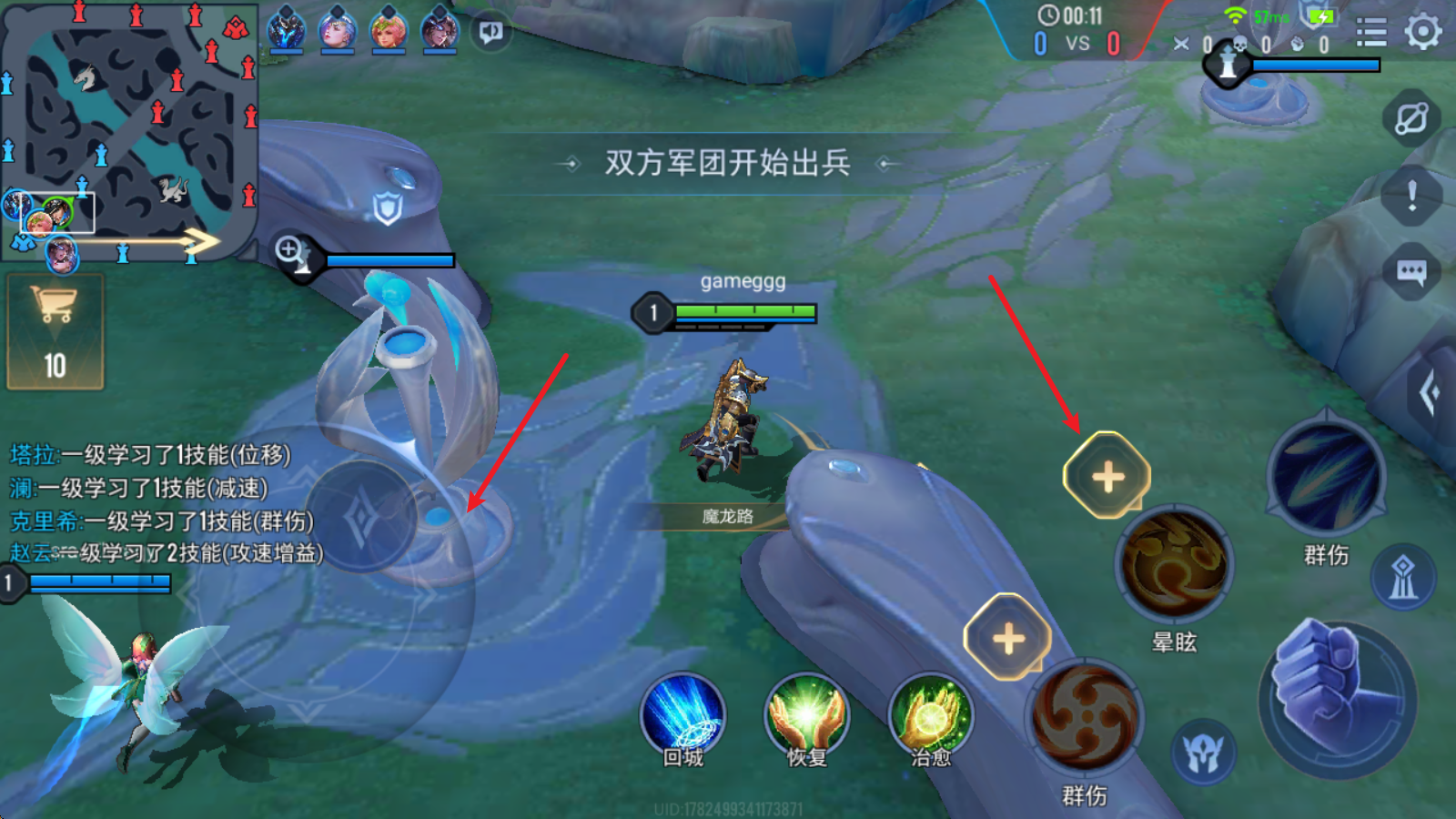 3、进入游戏后,左侧的摇杆控制人物进行移动,右侧则是技能,点击技能上方的加号即可学习。