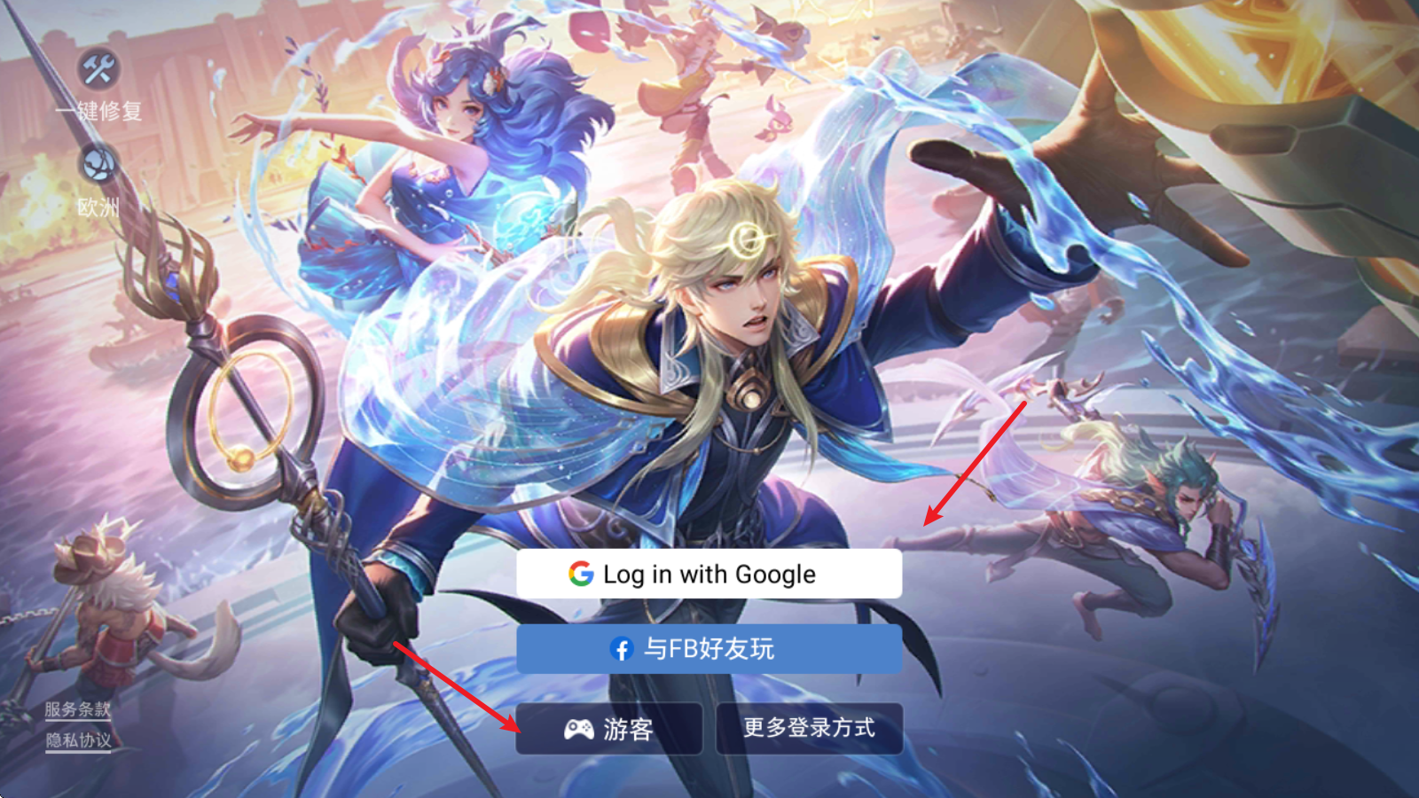 1、进入游戏后,我们可以在界面中通过谷歌账号或者是脸书账号登陆,如果都没有就直接用游客登陆。