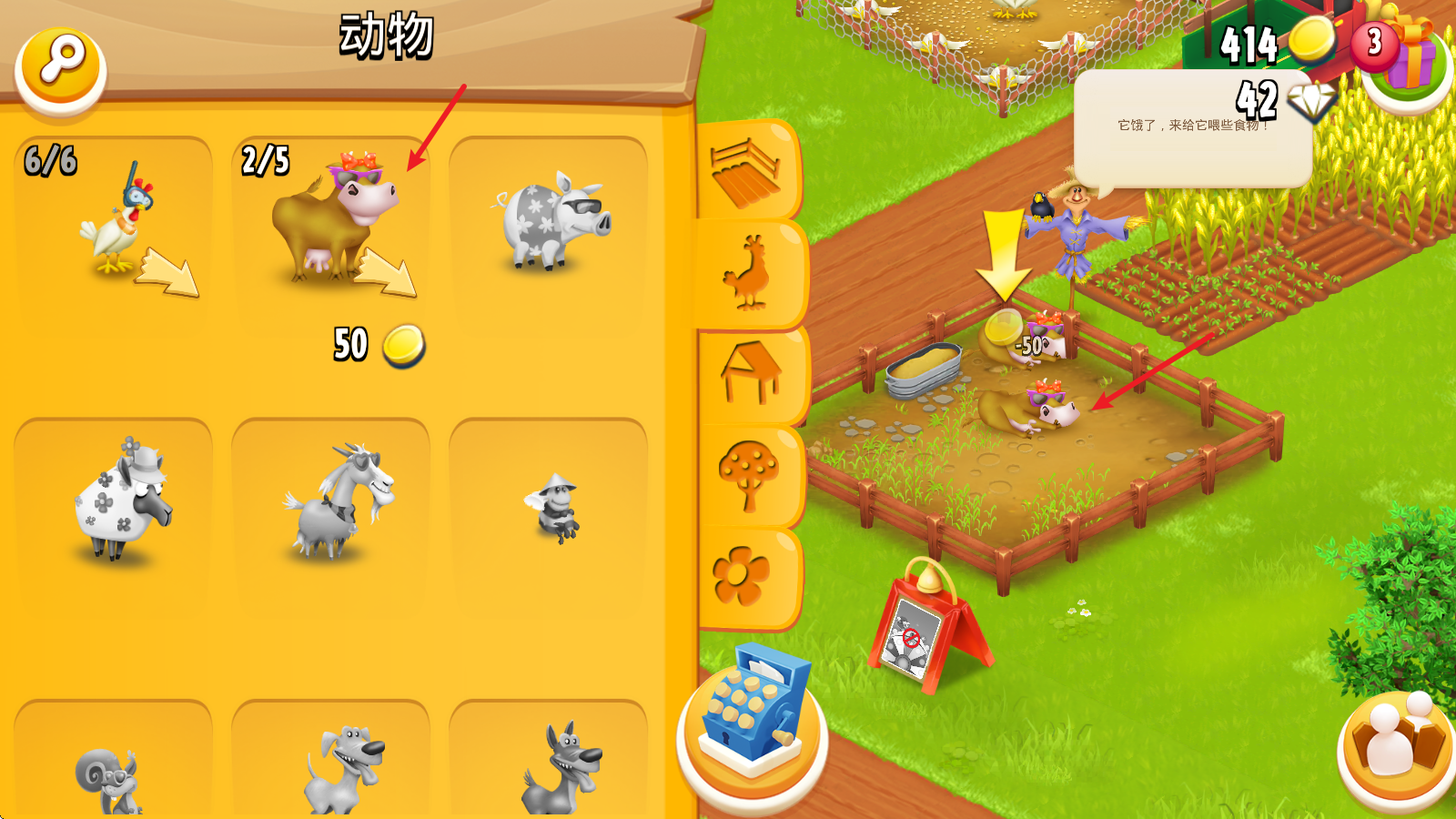 5、有了饲料之后,我们可以点击进行使用,这样牧场中的动物就会提供一些农产品了。