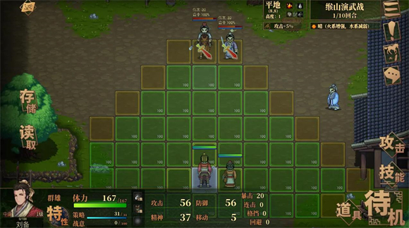 3、地形适应力为某兵种在某种地形上可获得多少属性加成/降低。例如群雄攻击力为100,而在荒地/林地/山地适应力为90,群雄系兵种在该类地形具体属性为100*90%=90,某些角色需站在某些地形提升属性防止被突脸秒杀的情况出现(具体的地形适应力会在可移动区域显示)。武将在较高高度攻击时存在一定伤害加成,反之则会减伤,高度差>1时不可移动也不可进行近战攻击,且低地形移动至高地形时移动力存在一定损耗。移动力损耗例如刘备移动力为5点,而在林地/荒地/山地移动力损耗为2点,当前回合可移动两格且剩余1点移动力,那么下一回合则会获得5+1=6点移动力,即可移动三格。当前回合角色未发生移动,剩余移动力重置。法术显示彩色代表该地形可使用该系策略,置灰则无法使用,需注意土系策略释故以攻击者所处地形是否为有效地形判断策略能否释放。