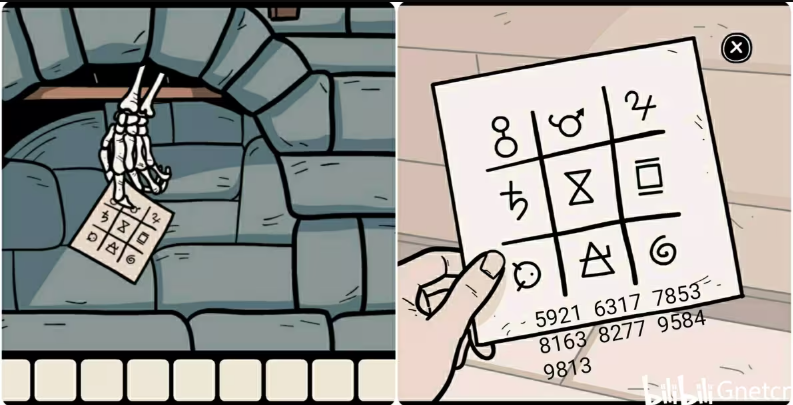 5、来到壁炉那里掀开画框上的白布进入剧情,接着对壁炉使用对讲机收到一张纸条,观察上面的符号,结合收音机的频道数字即可获得四个符号密码。