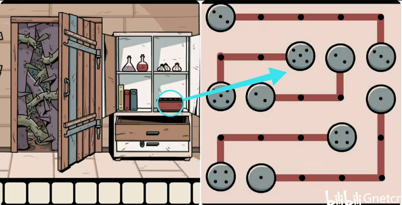 6、输入符号密码打开正大门右边的柜子,再点击右下方的红色盒子完成上面的机关(连连看)即可拿到里面的白色宝石。