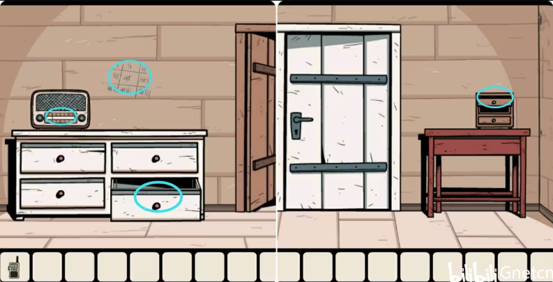 4、在白色门右边的抽屉柜里拿到两节电池,先把电池装进对讲机,然后将频道调到4听对讲机里播放的音乐,再点击收音机调整频道至你所听到的音乐频道上(这里要记住频道数字,不同音乐对应不同的频道)。