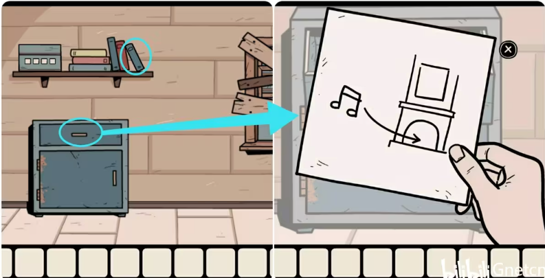3、进入楼梯间拿走架子上的蓝色笔记本,再打开保险箱上层的抽屉观察里面的纸条,纸条上提示我们对烟囱播放音乐。