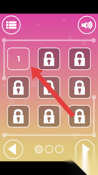 2、实体信息包含“1(表示可游玩关卡)”、若干带锁图标,以及菜单(左上角列表样式图标)、音量(右上角喇叭样式图标)、关卡切换(左右方向箭头)等交互类元素。