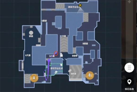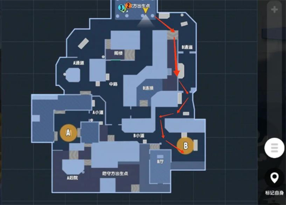 6、决斗都市防守方开局直接从出生点左侧附近木箱上来到A小道这个拐角架住观察中路,来到拐角处需注意中路前方的木箱(好多玩爆破的人都喜欢躲木箱后,利用子弹穿透直接打就行)同时也需注意脚步提示方向留意右边B楼梯的人摸过来偷袭。解决完中路过来的敌人,就听枪声提示,如果枪声朝B点方向就从B楼梯推进到B点区域。B通道是大概率与敌人发生交战区域,建议防守方可以让几名队友从B斜坡推进到墙角进行正面埋伏卡视角。敌人大概率会躲在B通道石头后面,这时又让几名队友从侧面B楼梯摸上去进行包围夹击。