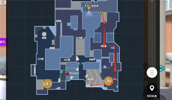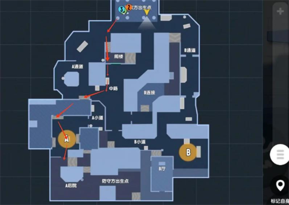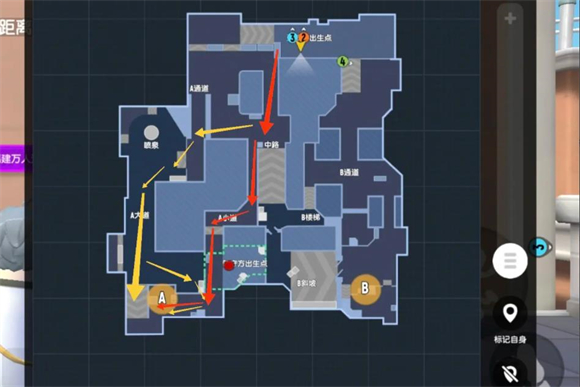 4、爆破派对分别有决斗都市和天空秘境两种地图,接下来讲解两种地图各打法思路,首先是决斗都市地图讲解。决斗都市进攻方打A推荐走红线,开始后直接冲到中路对着前方木门乱扫,敌人大概率会躲在门后。玩这模式有个打法是运用爆破派对只要是木头建筑物子弹及投掷物都能穿透机制(实战测试木门,木箱、木墙都可以)所以开局冲到中路往木门或木箱乱扫一破排点。如果解决完中路木门敌人或者中路没人就按路线往A小道推进,注意A小道有个拐角要特别留意,容易被敌人卡视角偷袭。(建议用粒子炮排点)排除A小道危险后来到A点时再次对着此处小木箱乱扫(大多在A点守点会躲这箱子)。成功夺得A点控制权敢快封烟掩护队伍成功下包,然后防守即可(起烟时附近有脚步也可往下包大概位置扔火球或粒子炮恶心敌人,住止敌人拆包。