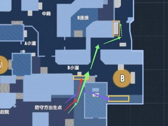 5、决斗都市进攻方打B直接往B通道按红色路线推进,注意到达B通道就不要直接冲过去,来到这石郭后观察B点是否有人,同时也需留意右侧B楼梯拐角的人偷摸过来。来到B点区域,需注意附近木箱是否有敌人。守包时好后有队友情况下,让某队友架住B通道过来的人,另外几位可以通过B点砖洞出来到这最靠墙角的草丛上,架住斜坡以及木门过来的人。