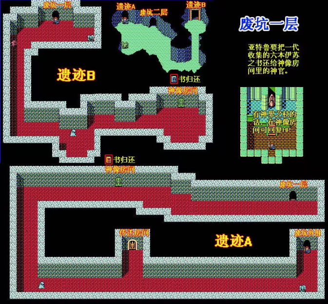 这片区域分为三层,每一层都留存着古代遗迹。遗迹中设有供奉神像的房间,六位神官的灵魂在此栖息。与这些灵魂进行交流,并将初代冒险中获得的六卷伊苏典籍归还给他们后,他们会为亚特鲁恢复生命值。