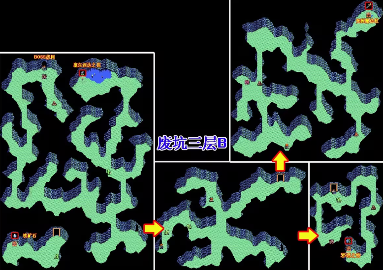 (4)、击败BOSS后,前往废坑矿三层的地下矿区,该区域地形错综复杂,不过藏有不少宝物。在这里能够找到[セルセタのはな塞尔西达之花]、[てつこうせき铁矿石]、[じやぁくな すず邪恶之铃]以及[ライトのまほう光源魔法杖]。