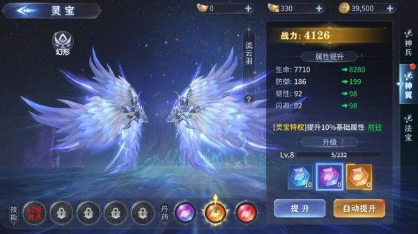 达到指定等级后神翼就会解锁,届时可使用神殿经验结晶提升神翼等级。