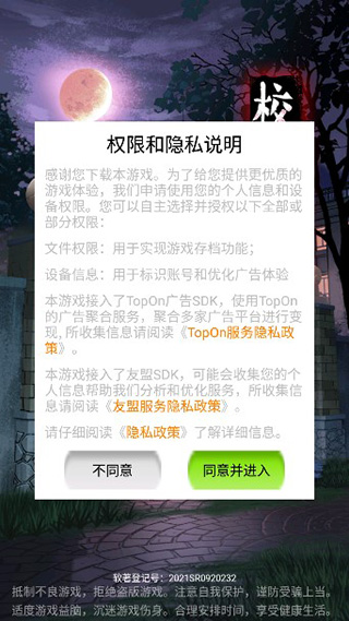 1、安装本站提供的《校怨诡社》游戏,进入游戏后需授予相应权限;