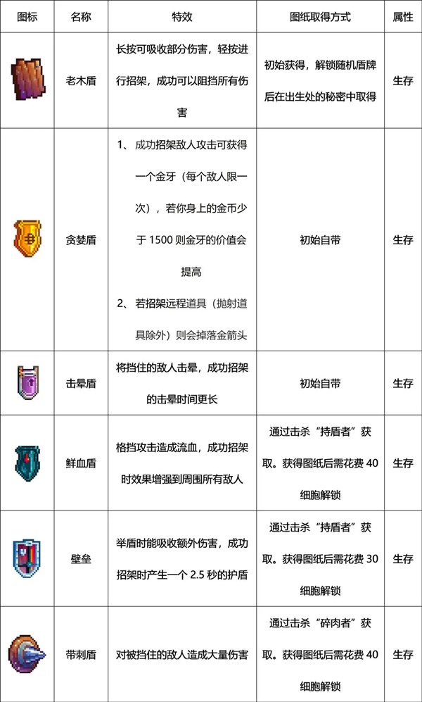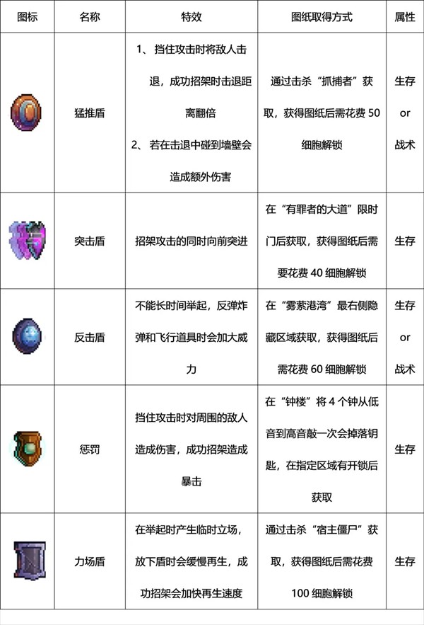 盾牌能够举起以降低所受伤害并反击敌人,若在合适的时机瞬间举盾,还可实现招架、完全防御并对敌人造成反伤,同时能弹回远程攻击。