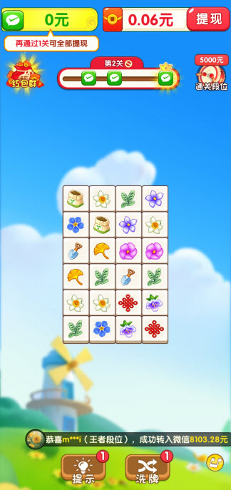 荣花富贵,连线消除玩法的红包游戏,玩家可以消除相同图案的方块来领取红包奖励,在荣花富贵里有很多的关卡可以游玩,非常多的奖励等你去领取,更多的挑战任务等你去完成,不断消除更多的方块来领取属于你的红包吧。