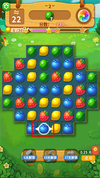 1、首先要做的是熟悉游戏规则,这类玩法其实都差不多,只要把几个相同的水果连成一条直线就能完成消除,消除之后上方的水果会自动下落。