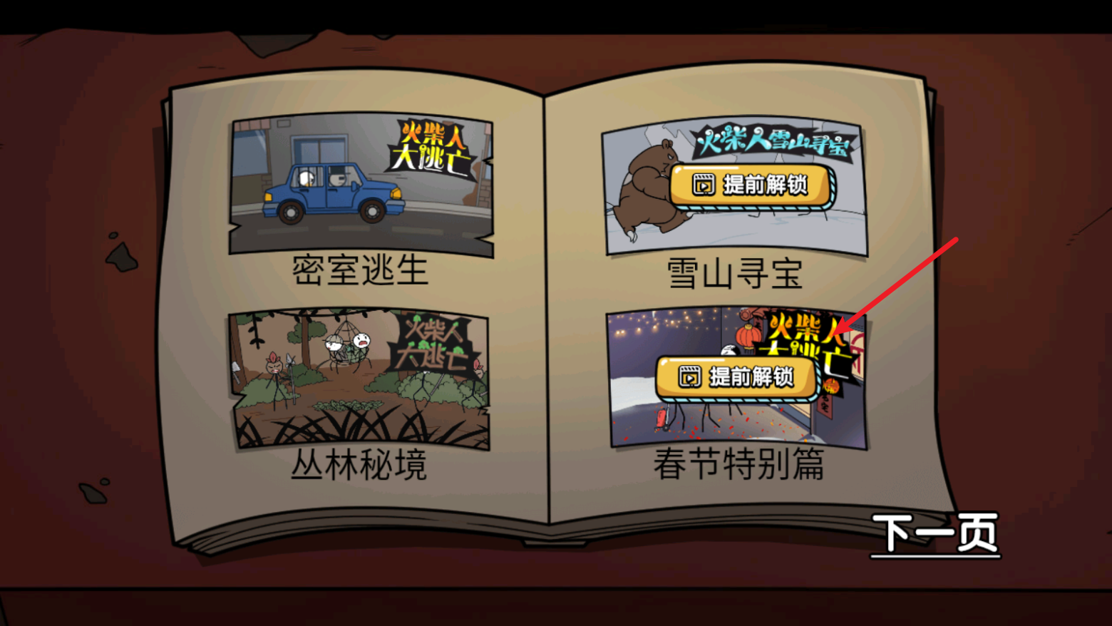 火柴人大逃亡总集篇,趣味的火柴人冒险闯关游戏。这一次带来的是合集版本,密室逃生、雪山寻宝、丛林秘境、春节特别篇等多种主题关卡都能体验,并且设置了功能,不需要一章章的解锁,想体验哪一章都可以!帮助火柴人完成各种有趣的冒险挑战,解锁多样的结局吧!