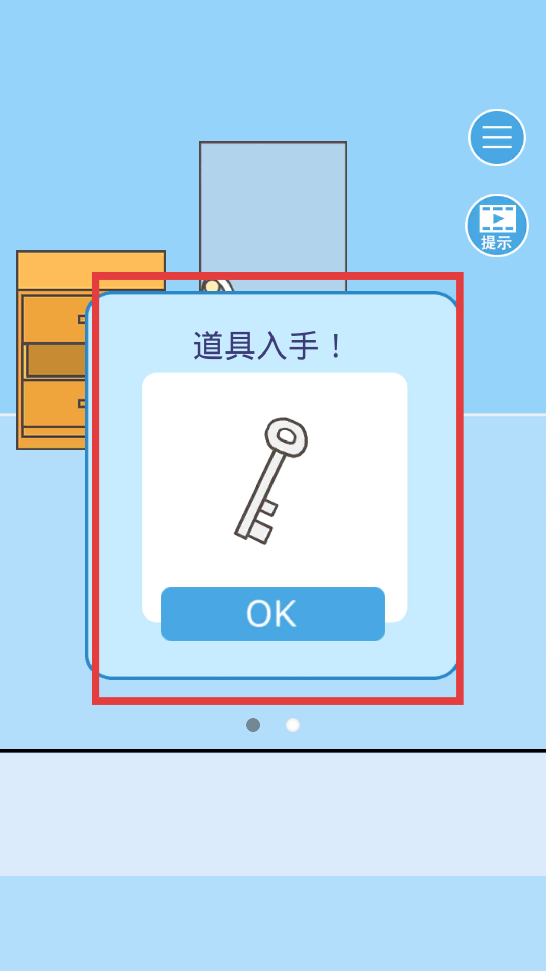 2、点击中间抽屉的钥匙后,界面会弹出道具获取的提示窗口,窗口中会显示刚得到的钥匙图案,点击窗口里的OK按钮关闭提示窗口,这时候钥匙就会被收纳到游戏道具栏中。