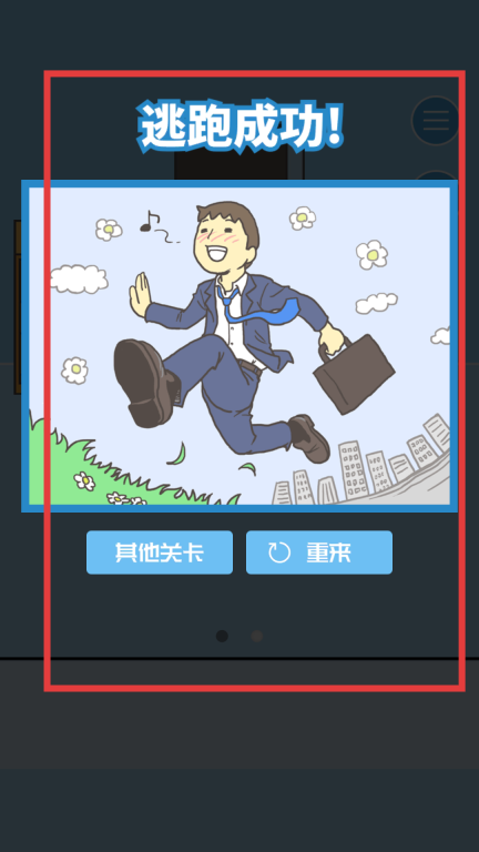 4门的锁定状态解除后,操控角色执行开门动作,角色便顺利离开房间完成逃脱,此时界面会弹出逃脱成功的提示信息,同时提供进入其他关卡和重新挑战当前关卡的两个功能按钮。