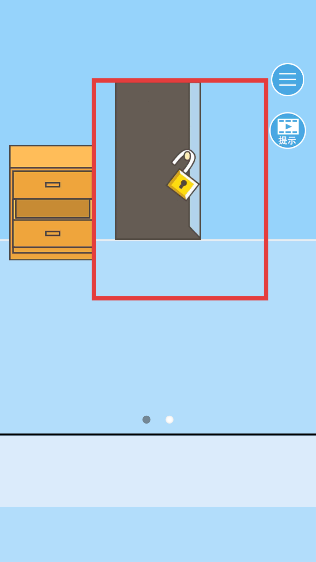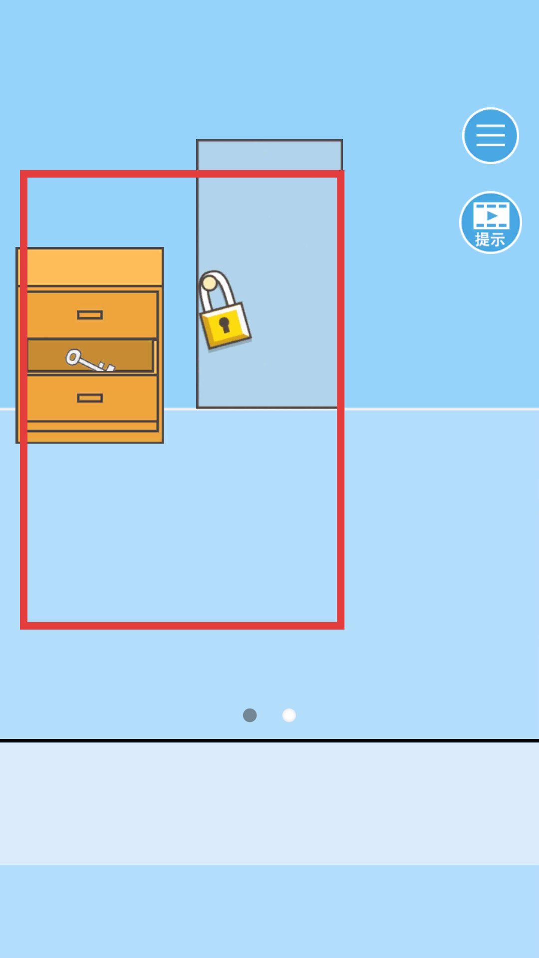 1、进入“走出办公室逃离公司”的初始房间界面,这里有一扇带锁的门和一个抽屉柜,柜子中间的抽屉里放着一把钥匙,点击该抽屉,尝试取出里面的钥匙。