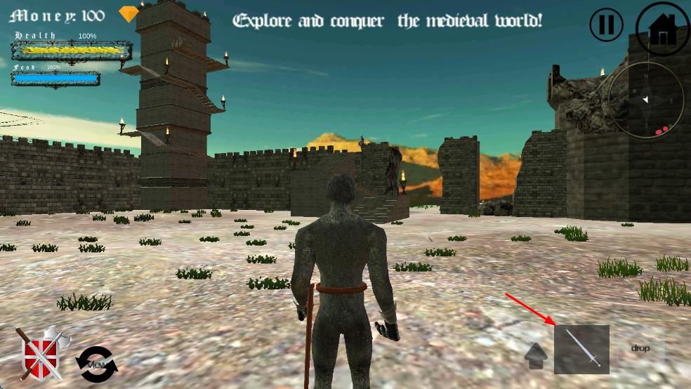 1刚进入游戏时,玩家需要操控骑士在广阔的3D地形里展开探索。可以在森林中采集野果来填饱肚子,同时要留意周围可能出现的强盗骑士,和他们战斗并获取金币。