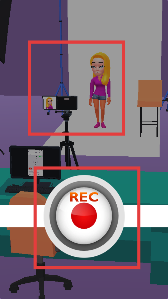 1、点击下方红色圆形的录制按钮,将镜头对准场景中站立的角色,录制其在摄影棚内卸妆时的动作与神态,以此完成拍摄任务。