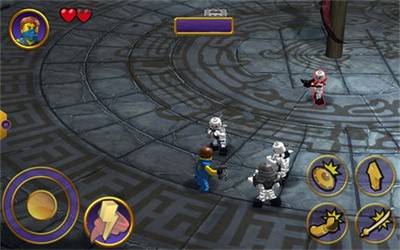 游戏画面相当精美,尽管角色呈现出乐高积木的风格,但战斗过程丝毫没有机械感,每一个打斗招式都洋溢着灵动的韵味。游戏沿用了经典的RPG动作类游戏操作模式,玩家借助左下角的摇杆操控移动,右下角则设有攻击、跳跃、防御、徒手格斗等技能按键,按键布局较为合理,操作时也没有任何滞涩感,十分契合现代玩家的格斗偏好。