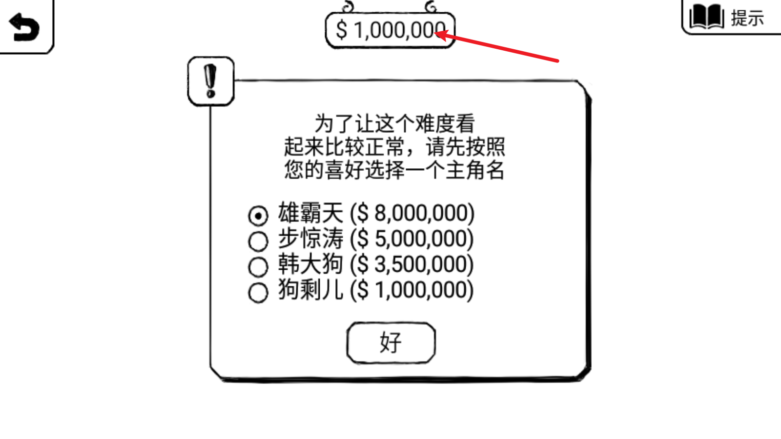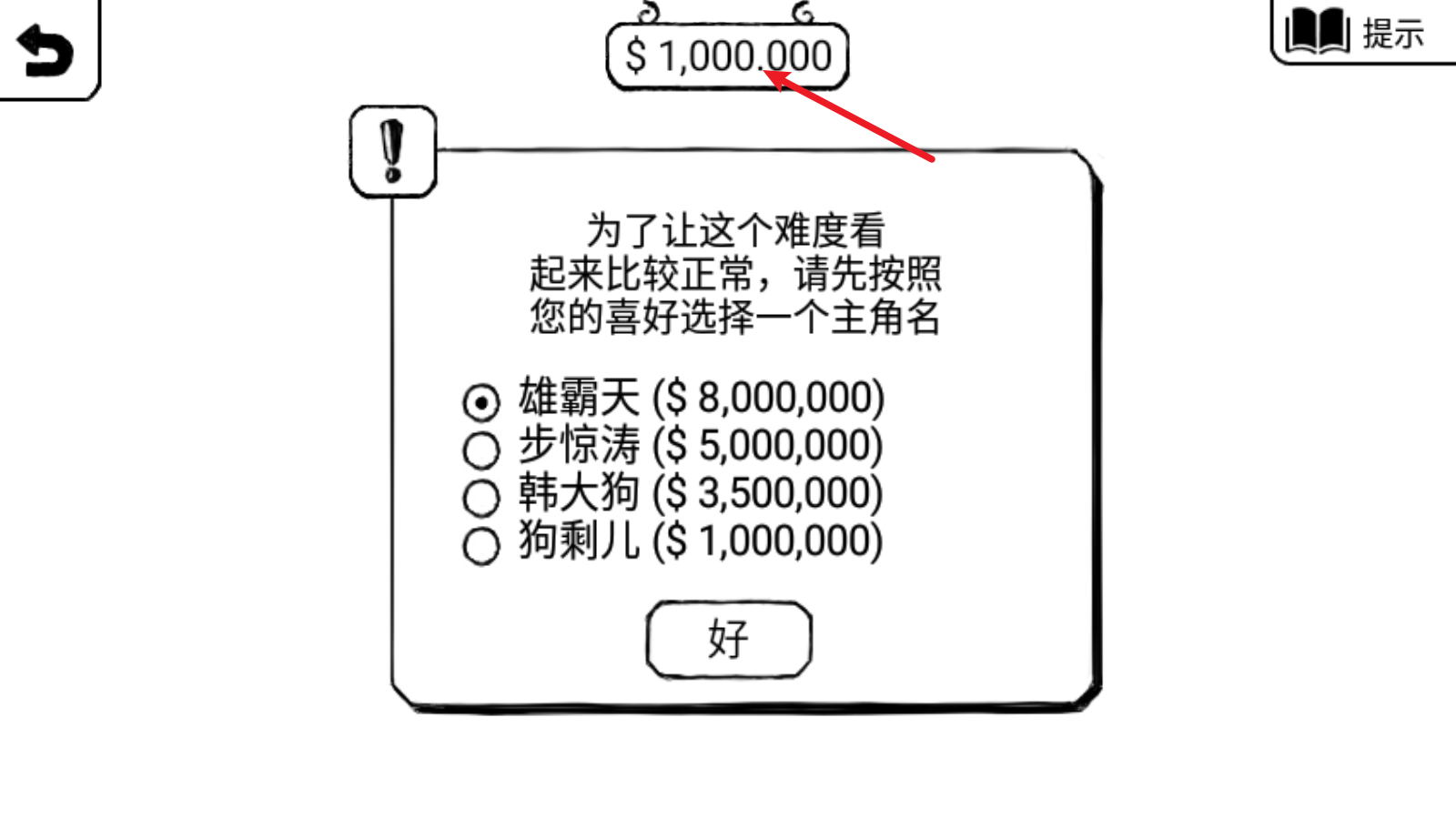 1、正式开始游戏后,玩家需要选择一个主角名,但是这里的重点不是取名,而是上方的初始资金,这里仔细看发现是1000,玩家可以点击一下,就会变成1000000了。