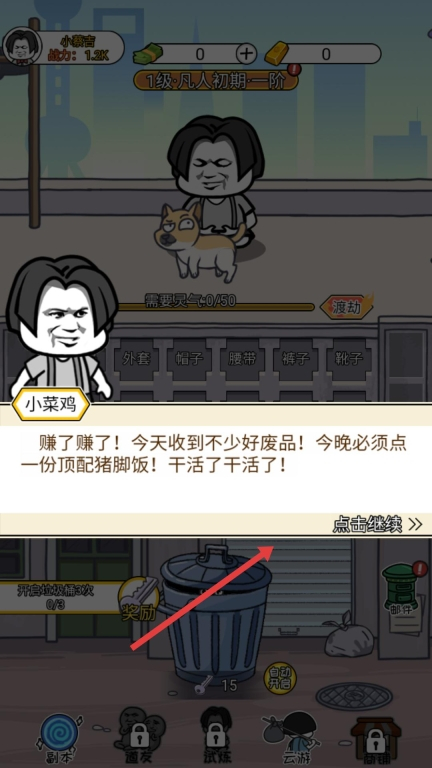 1、进入角色场景后点击“继续”,推进剧情对话流程,完成后打开垃圾桶,从中获取装备。