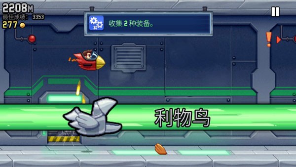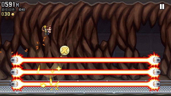 2、轻触任何位置开始游戏,点击屏幕人物就会往上飞,当不点屏幕就会降下,依据金币和道具的位置来进行调节,游戏而类似于像素鸟的玩法,但还加入了射击功能。期间遇到有电流的障碍,需要躲避,不能出碰,不然游戏GG,