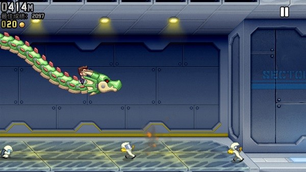火箭飞人是一款横版跑酷游戏,游戏中我们的小人背着喷射背包在场景中摧毁各式各样的武器和机械障碍物逃出实验室。火箭飞人采用了关卡设计,玩家可以通过搭配装备来提升移动速度和武器破坏力击败邪恶科学家的手下。火箭飞人可以高自由度装扮角色,诸多高科技配件和载具可以使用。