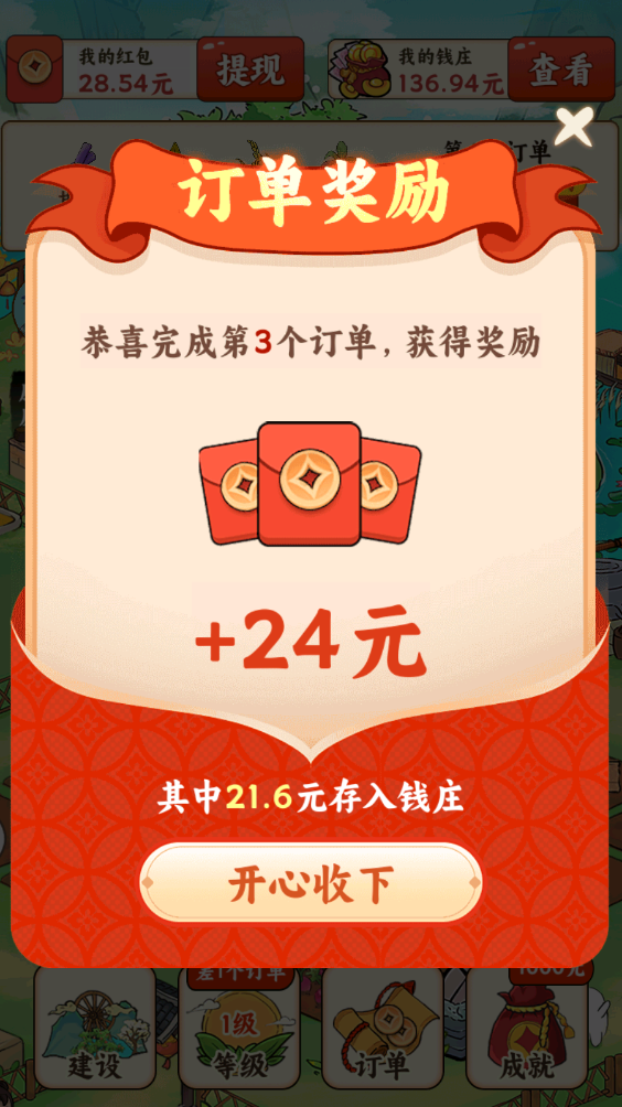 真的可以兑换,游戏中的红包都是通过完成订单或者观看广告的方式获得,前期完成4个订单左右就能将自己的红包积累到30,然后按照百分之一的比例进行兑换,可以达到最低的起提门槛0.3,小编实测秒到账哦!