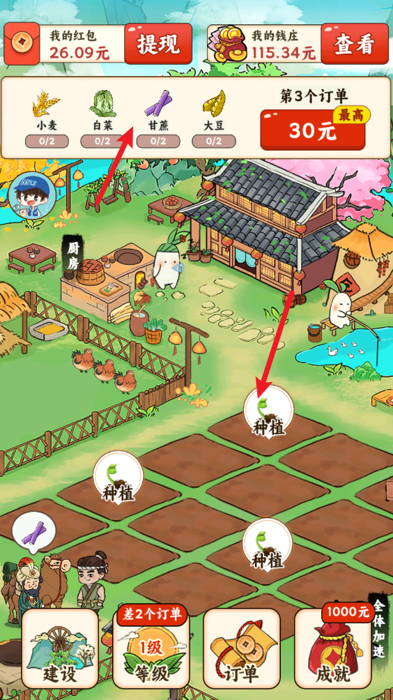 1、游戏中玩家可以查看上方的订单详情,然后点击空地种植对应的作物。