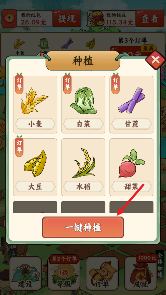 2、在种植界面会标识出订单所需的作物,点击即可种植,也可以选择一键种植。