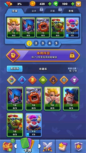 6、在主界面点击下方的卡牌可以对你的英雄进行升级,也可以解锁新的英雄。