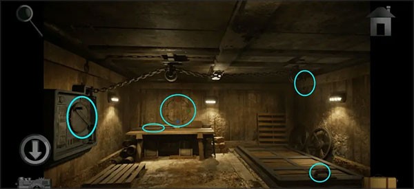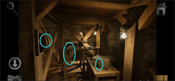 7、回到储藏室用铁链将钩子和地下室门把手进行连接,然后用锁固定铁链,再转动轮盘升起地下室的门。接着进入地下室拿走箱子上的「摇杆」,再记住钟表上的时间提示。