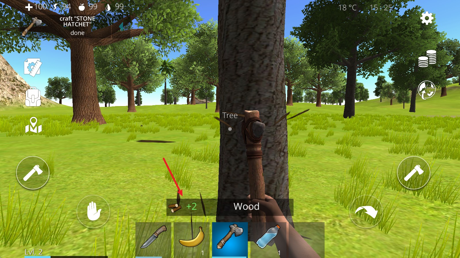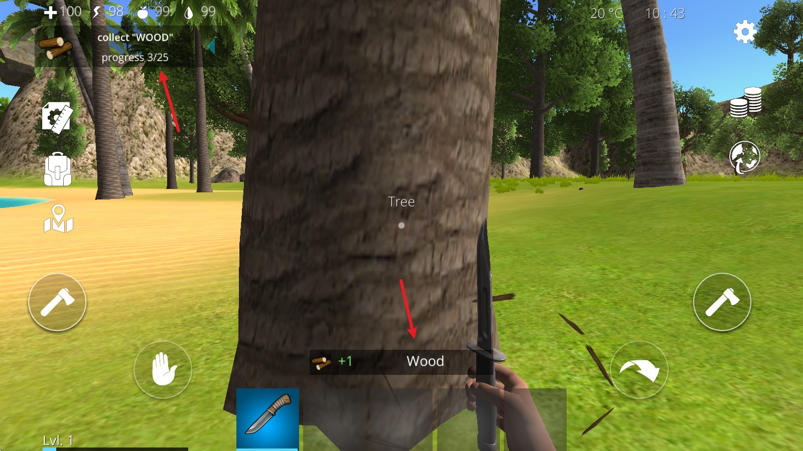 4、例如这里拿出小刀后,我们对准树即可获得树木资源,也可以完成左上角显示的任务。