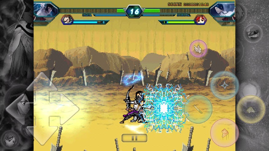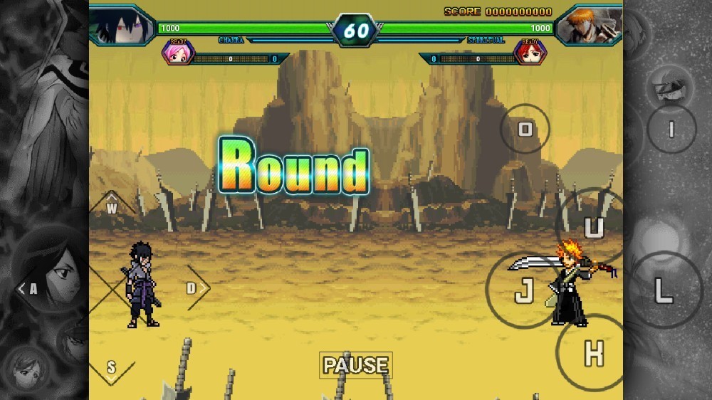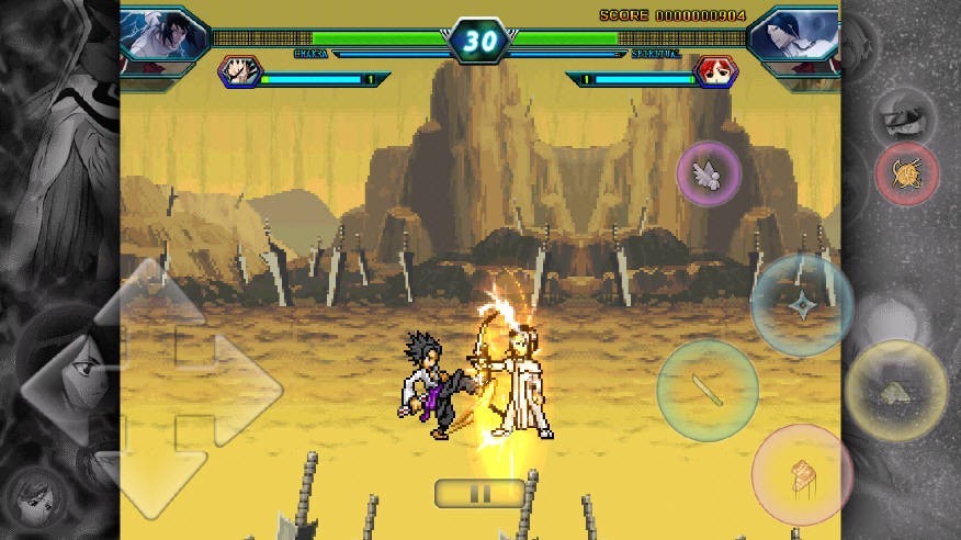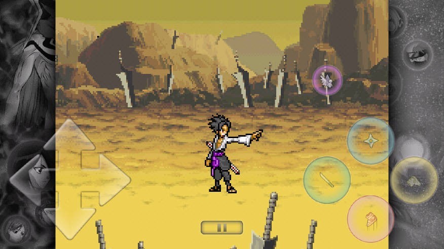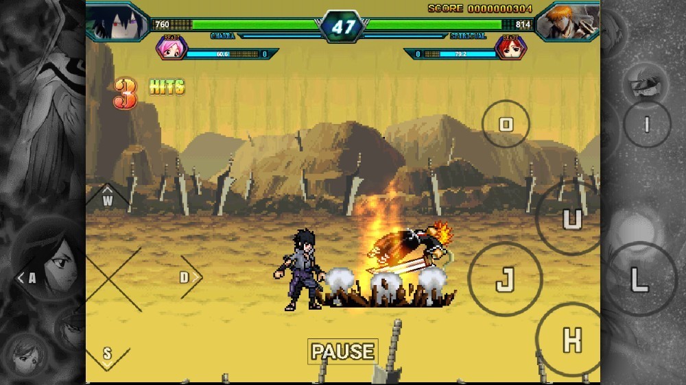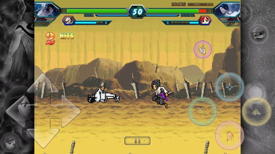 4、进入游戏后,左边控制角色的移动,右边则负责攻击,还可以点击下方中间的【pause】暂停,在战斗的时候还要注意上方的绿色血条哦,如果绿色血条快用完了,注意要躲避对手的攻击;