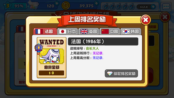 游戏开始按钮的旁边设有一个PK按钮,点击该按钮会进入全球盗贼排行榜界面(在此需特别注意:一旦点击参与排名,就会直接进入游戏,所以务必提前准备好游戏道具再进行操作),进入界面后可以选择参与排名,也能领取排名奖励(具体界面可参考下图)。