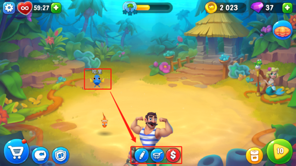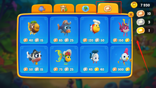 点击左下角“商城”,可购买装饰道具、鱼儿、道具礼包等。
