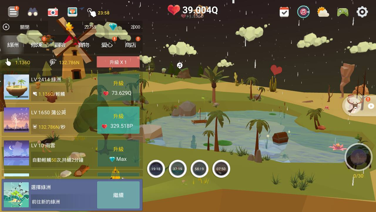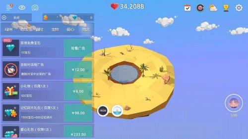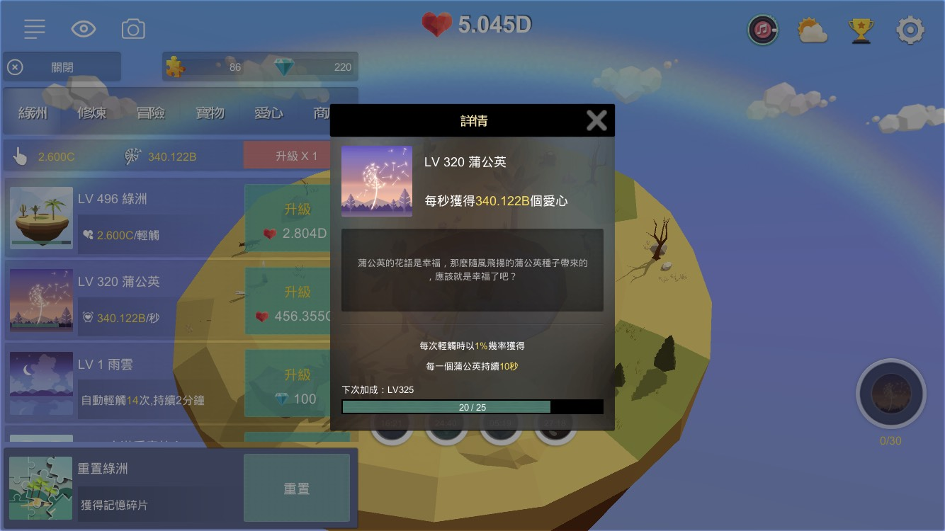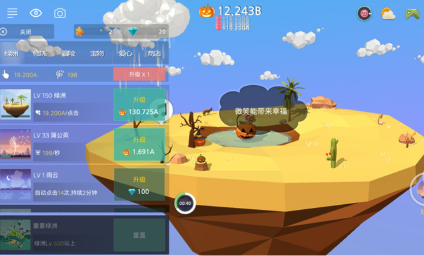 点击绿洲就能获取爱心,岛屿升级后会解锁更多建筑和互动内容。