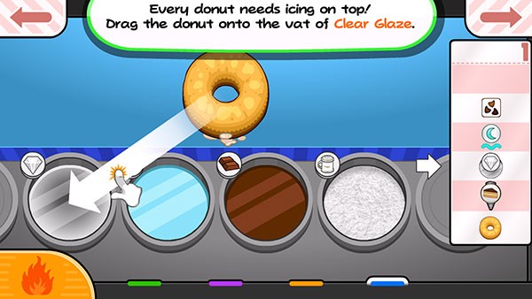 3、甜甜圈炸制完成后,我们接着把它移到【淋酱区】,挑选顾客心仪的酱料。