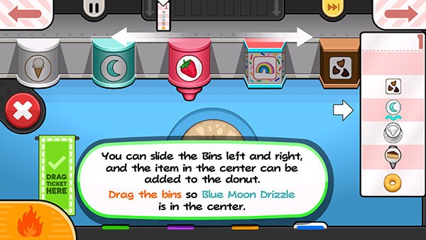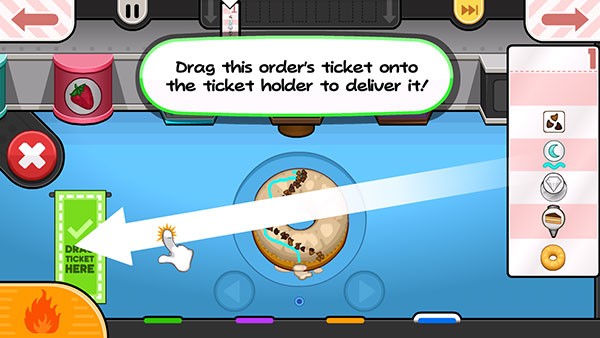 6、所有步骤都完成后,记得把制作好的甜甜圈拖到左边,再把订单交付给顾客。