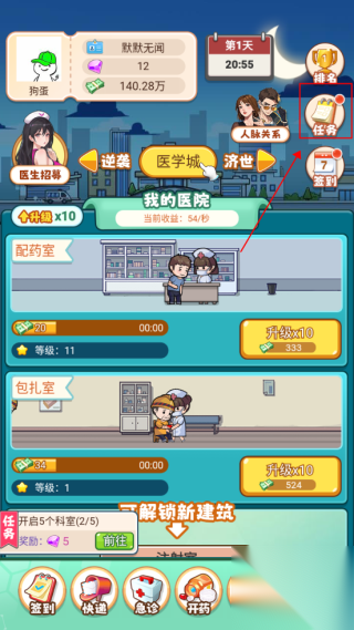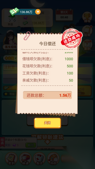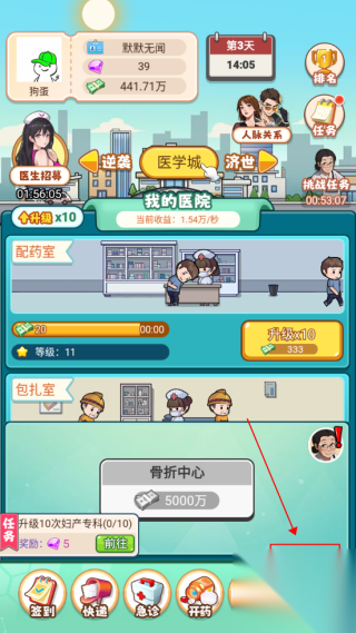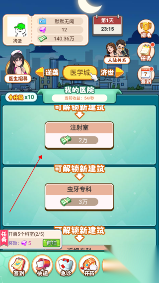 2、诊室建设升级:有足够资金时优先解锁和升级诊室,提升接诊能力和收入效率。