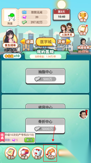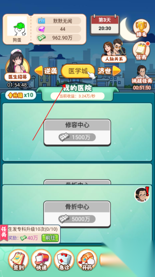 5、探索医学城:前往医学城开启全新地图与挑战区域,提升医院整体声望。
