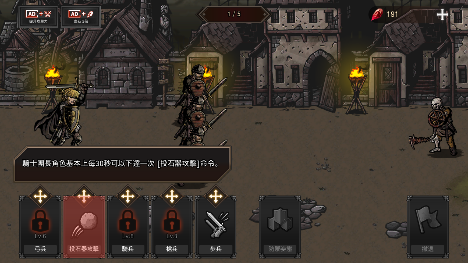 3、技能释放:点击兵种卡牌触发突击,或释放骑士团长投石攻击。