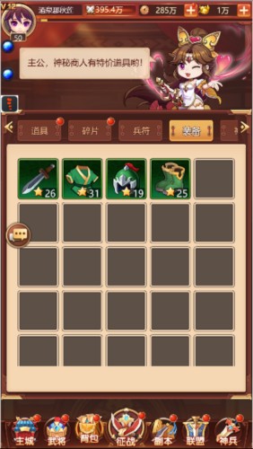 2、【装备】包含武器、战甲、头盔、战靴这4个类型,每位武将在每个装备类型上都只能穿戴1件。