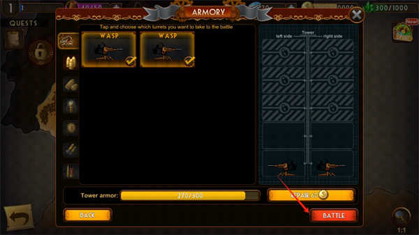 4、调整防线布局并部署炮塔,点击【BATTLE】按钮即可开启战斗。