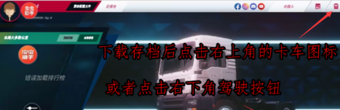 4、接着点击右上角的“卡车图标”,或者点击右下角的“驾驶”按钮,进入车型选择界面。
